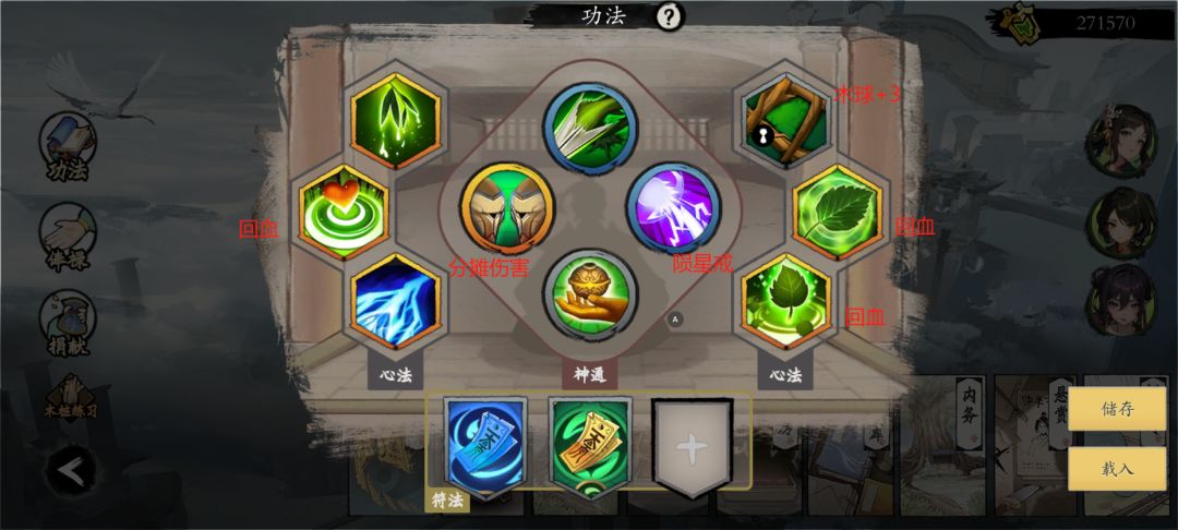 装备必带朱雀衫,功法如下图(“强木弩”和“云霖典”可以换成神识心法,或者换成“唤灵诀”,或者随你)。云霖点可以带残卷,不修炼也没事。