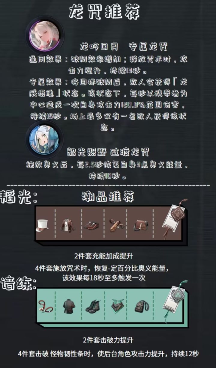 关于输出位:烛和长命锁,因为两者都能吃到暴击率的加成。那么选哪个作为配队主要还是要看角色的养成情况,哪个的胤痕高、潮品齐全、养成高就选哪一个。