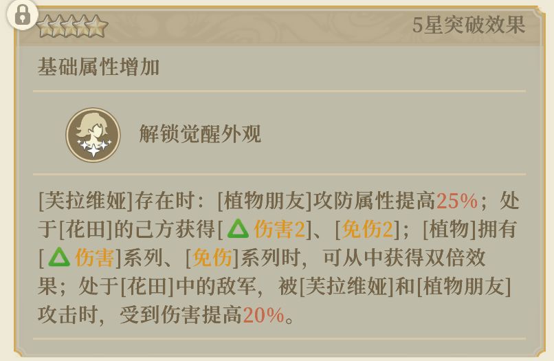 特别是5星增加的主效果,仅提升[芙拉维娅]和[植物朋友]。