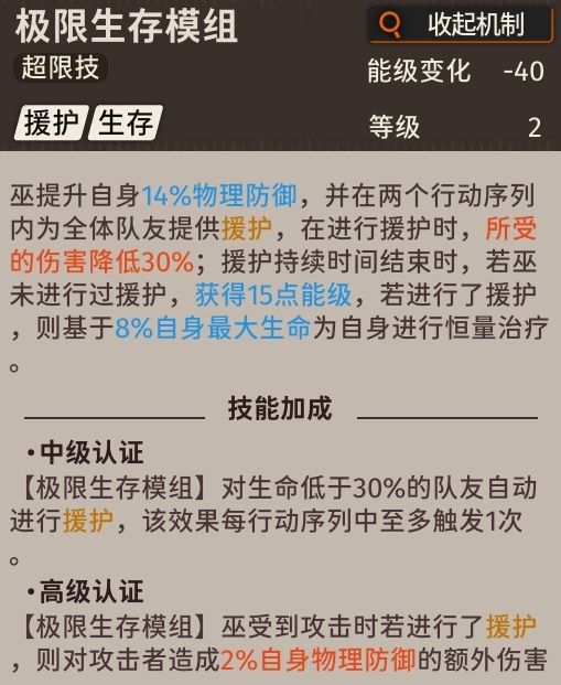 巫的大招就等于直接将自身作为一个肉盾使用,使用大招后巫将提升自身12%的物理防御,并将在两个回合序列以内为全体队友提供援护。