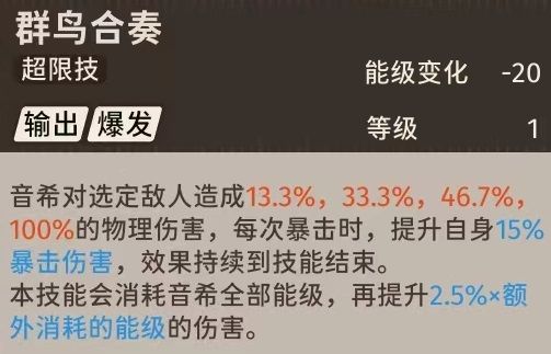 每次暴击时都能增加自己15%的暴击伤害!这意味着音希的伤害是直接与自己的暴击率挂钩。