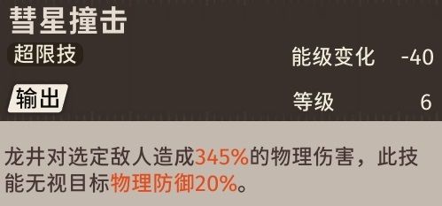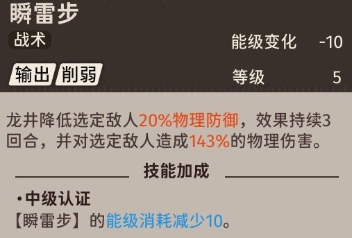 然后就是关于龙井的战术,龙井的战术可以降低选定敌人的物理防御效果三回合,并且还能对选定敌人造成124%的物理伤害,当龙井升到中级认证以后这个技能就不用消耗能量了!非常实用的战术