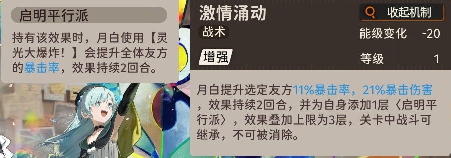 月白能给友方加暴击率和暴击伤害,效果持续2回合,能极大增加C位的输出能力
