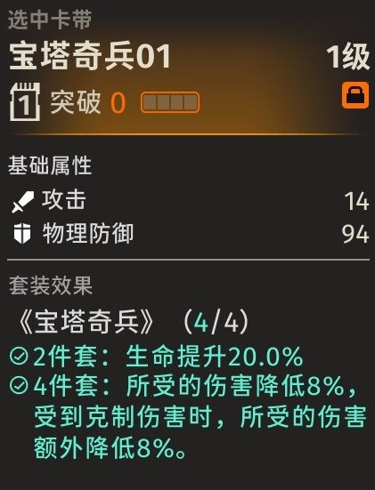 卡带推荐宝塔奇兵,两件套时就可以提升20%的生命值,四件套时还可以使所受的伤害降低8%