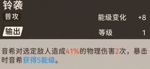 关于音希的普通攻击,值得注意的就是攻击暴击会额外获得五点能量,幸运状态下每次的普通攻击都可以增加13点能量。