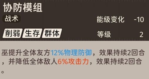 战术则可以提升我方的物理防御且能降低敌方全体攻击力,两种效果都持续两回合。