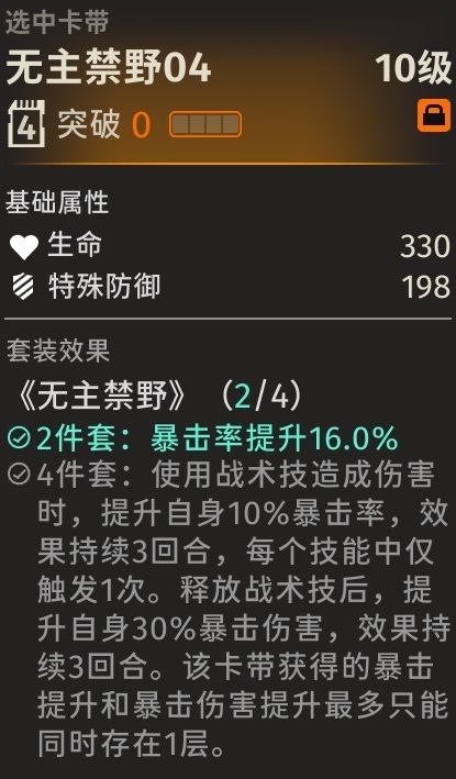 卡带推荐为无主禁野,音希的技能都是跟暴击率暴击伤害有关,而在释放战术时会触发4件套叠加暴击率和暴击伤害,非常适合音希