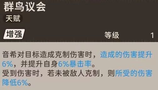 受到伤害时若未被敌人克制则所受的伤害降低6%,这使得音希自带减伤以及增暴