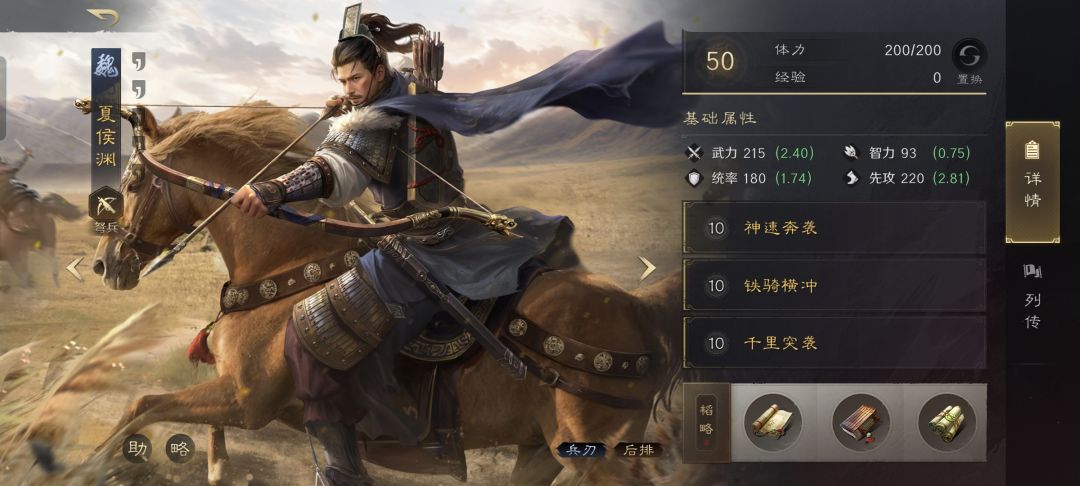 夏侯渊战法:神速奔袭+铁骑横冲+千里突袭。