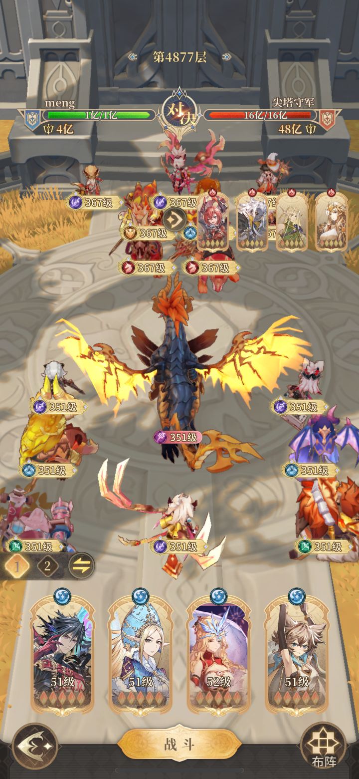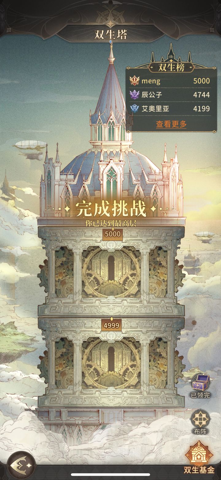 图一正常挂机推关阵容(我体验甚至不需要调整位置用呜咽推开对面羽刺,本人实践在4997层也没问题)。二队有啥带啥我带的的是火队收尾