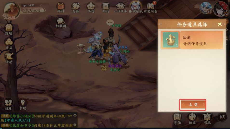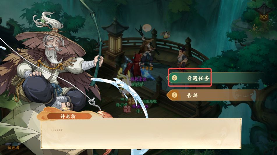 38、山神传说:垂钓仙境地图中间与树下⽼者对话-西岐NPC酒楼老板买琼华酒-返回垂钓仙境交付给树下⽼者获得医膳宝典(奇遇任务34:寓医于食需要使用的道具)