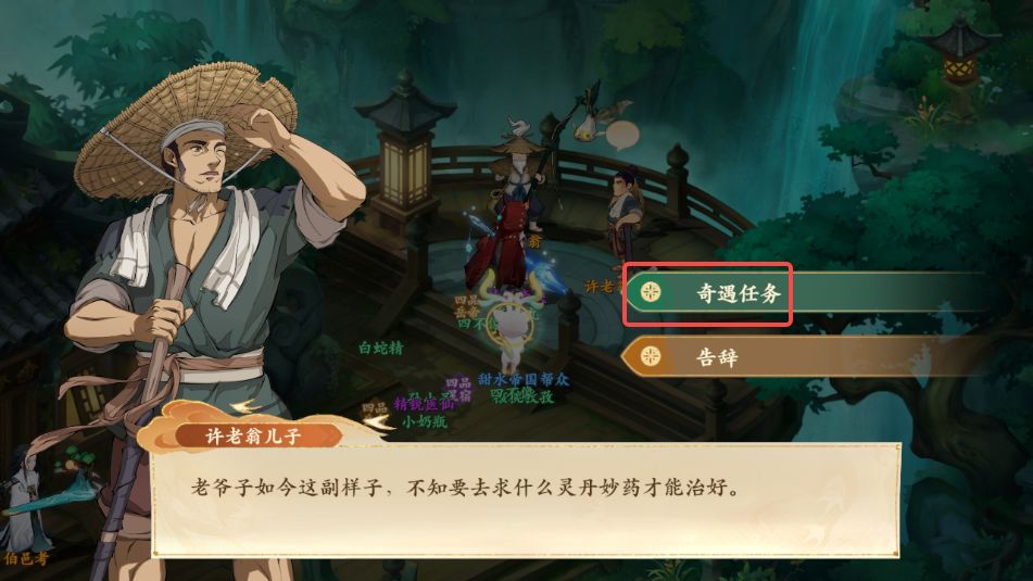 7、对话结束后,回到许老翁处与许老翁儿子对话,上交回魂丸(奇遇任务35:乘风行远完成后获得)后任务完成