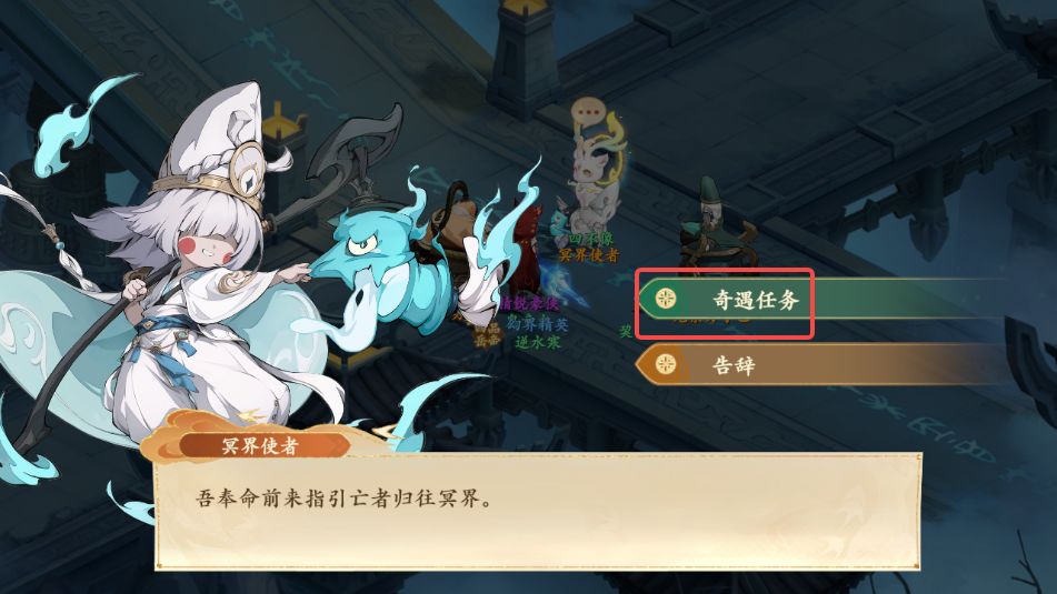 4、剧情结束后回到刚才的地方(如图所示处),与冥界使者对话,触发战斗,战斗胜利后,任务完成