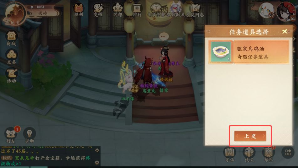 9、再次与酒楼老板对话,选择奇遇任务,上交驱寒乌鸡汤,任务完成同时失去医膳宝典