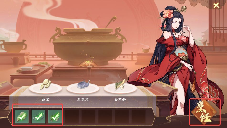 8、购买后再次与酒楼老板对话,选择烹饪,放入白芷、乌鸡肉、香草料之后,点击烹饪后获得驱寒乌鸡汤
