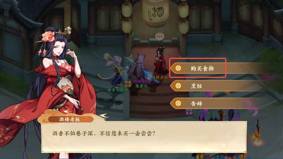 3、剧情结束后前往西岐如图所示酒楼老板处与其对话选择购买食物,购买肉骨头