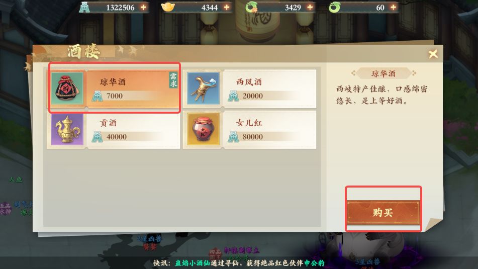 2、对话结束后前往西岐酒楼老板处,购买琼华酒