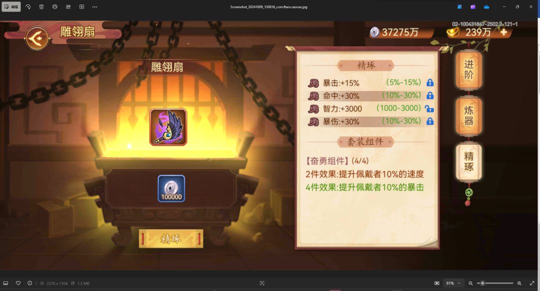 随便放一张图了就,可以看到,字、属性、数值上面那个标题由炼器变成了精琢,需要材料变成了10万银币,锁的颜色变了。