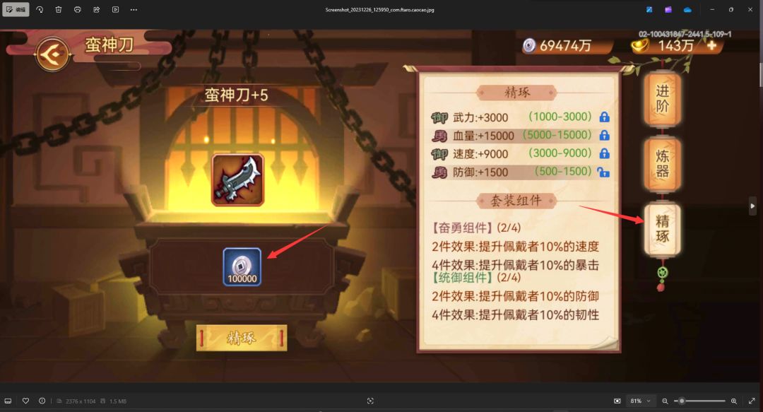 2、先炼器1次,看出了几个勇,比如出了2个勇,其中1个勇对应属性是武力,1个勇对应属性是策略,这时在炼器界面,把对应武力那个勇用炼器锁定符锁上,然后去精琢界面