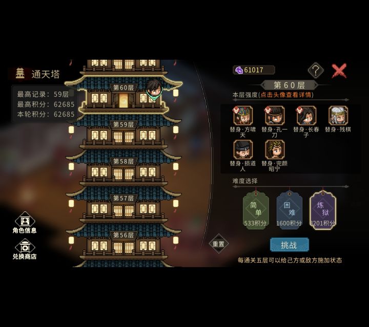 现在爬到59楼,还能继续爬。先截图分享。肯定不是最优打法,但是其中有本人对游戏的理解和思考。修罗炼狱难度。