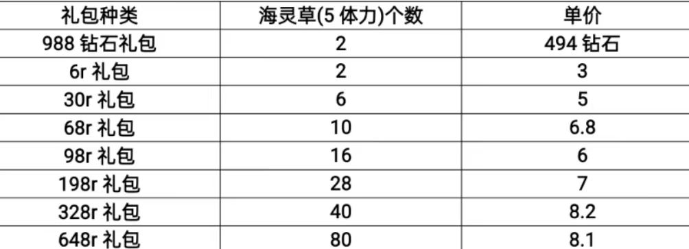 还是列表的方式计算各个礼包海灵草(5体力)价格供大家参考,大体趋势是礼包越贵体力单价越贵,注意体力单价648礼包比328礼包便宜,98礼包比68礼包便宜哦