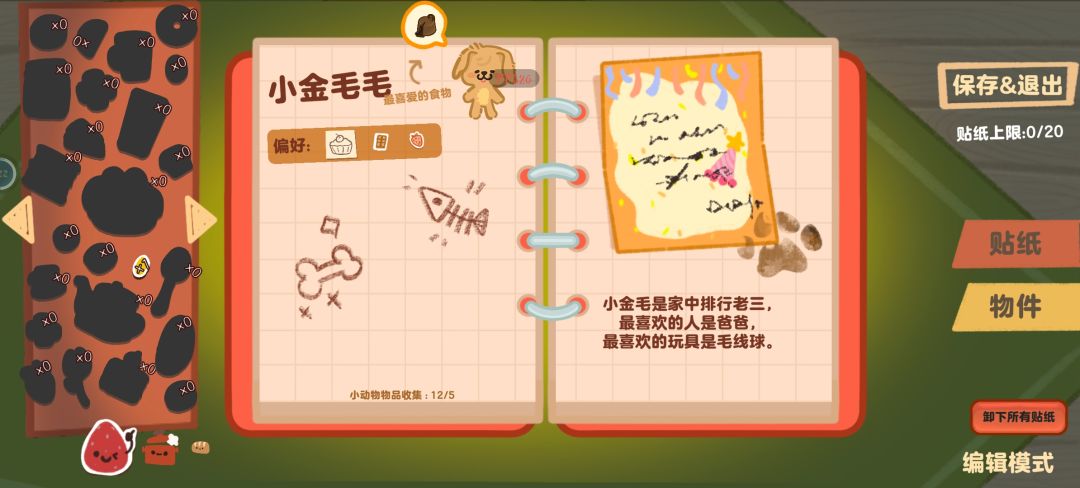 超可爱的手绘画风!!!超级喜欢小金毛,目前进度如上,可以给客人做手帐这个想法真的很棒!!!营业的时候突然跳出来的小鸡的对话内容也很可爱,期待期待游戏上线~