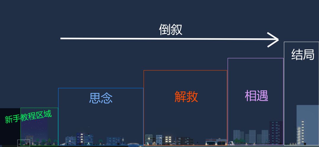 整个游戏的场景,都以倒叙的形式,在场景细节的表达中,分别从现在到从前(图4),阐述了【思念】-> 【拯救】-> 【相遇】这几个对与主角记忆最深刻的生命阶段。而【光】在游戏中的表达是意识的体现,所以游戏中许多好结局需要成就获得位置,都在光之下。