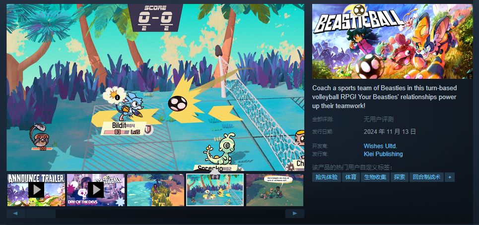 今日(11月2日),科雷官方宣布回合制排球角色扮演游戏《Beastieball》将于11月13日EA发售,游戏暂不支持中文,游戏Demo现已上线,感兴趣的玩家可以点击此处进入商店页面。