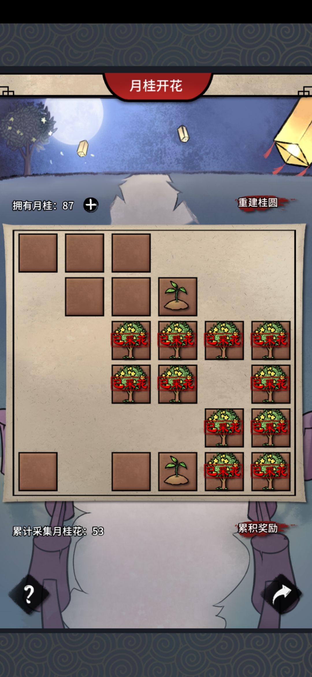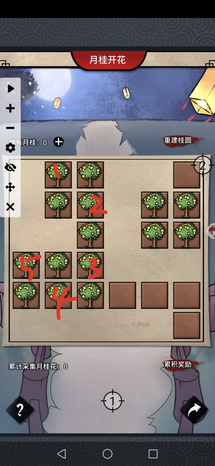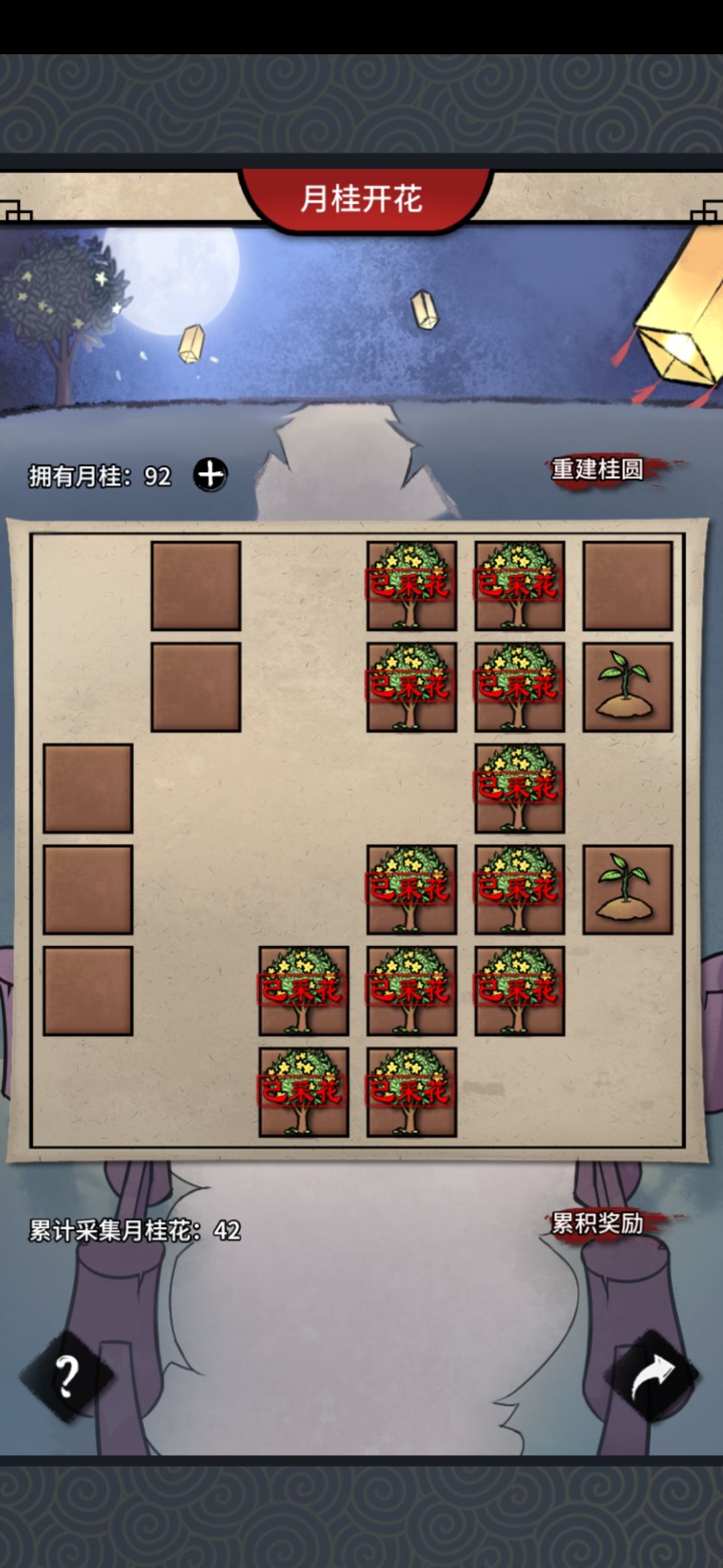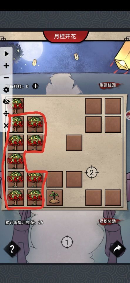 种地玩法:“田”对角线x点种法,相邻的两个就不要浪费月桂种子了,不论中间空多少个格子,横竖线上只要有格子没种树都不算开花条件。例如,(空格.无,无,无,树,树,),想要后面两颗树开花要把空格种树才能满足条件,变成(花,无,无,无,花,花),竖着也一样…