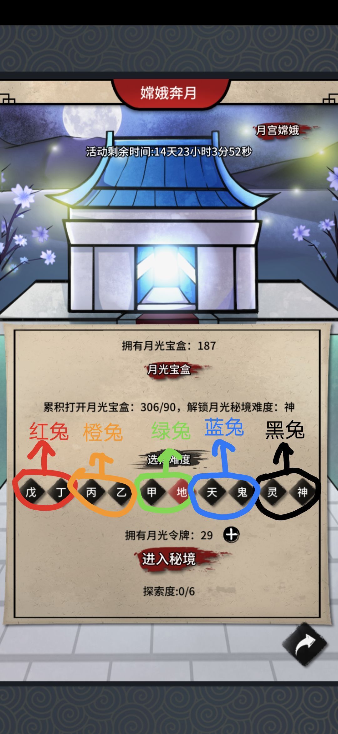 (天(不出),鬼)出现蓝色兔子,打败出第4件宝物;(灵(不出),神)出现黑色兔子,打败出第5件宝物;同学们拿到其中一个宝物后,就不要死磕一个难度了,跳到下个难度刷下一件宝物,收齐5件你就是欧皇。氪佬60加油基本也毕业了,非一点氪两个也毕业了。白嫖党尽力而为吧,非酋很难。未完待续。