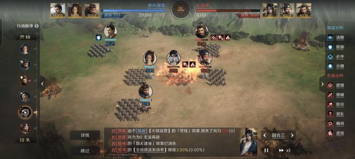 周泰和婶娘联合组成的防线,还是相当牢靠的。当中最大的亮点还是婶娘,一身都是带火的,仔细看了看才发现,原来同等级状态下,婶娘的先攻竟然比陆逊高。