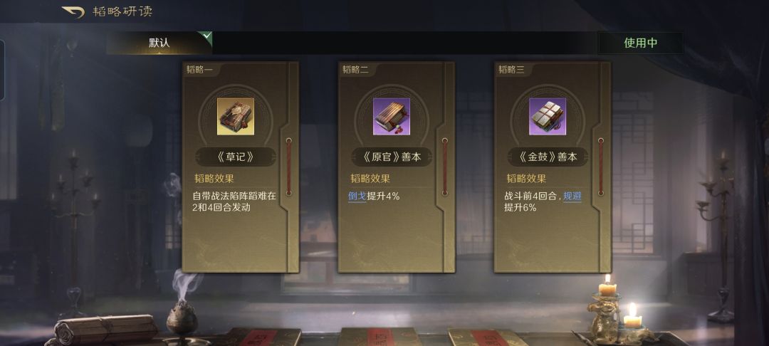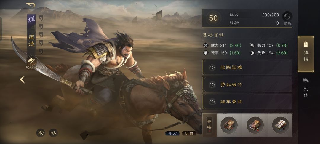 庞德战法:陷阵蹈难+势如破竹+破军袭敌。韬略库:草记(专属)+原官善本+金鼓善本。轻骑兵特性疾驰,专精点亮纵马驰矛。