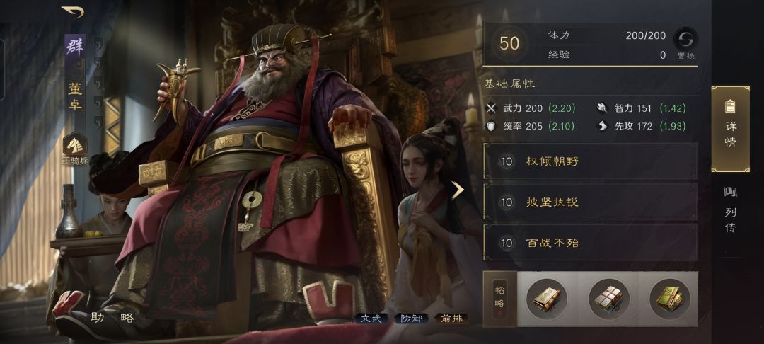 董卓战法:权倾朝野+披坚执锐+百战不殆。韬略库:束伍善本+军争善本+王臣(专属)。重骑兵特性坚韧,专精点亮铁马金戈。