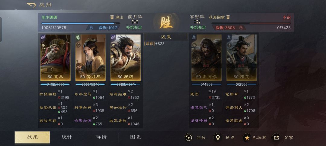老规矩,要是别人打的提供给我,就进行特别鸣谢,自己瞎折腾的,就不必特别鸣谢谁了。我这把利用董卓、庞德和黄月英摆出偃月阵,经历一番苦战之后,终于斩杀了关羽,后续的加时赛自然是赢了。要是也有跟我类似想法的朋友,不妨细致查看下文的复盘。