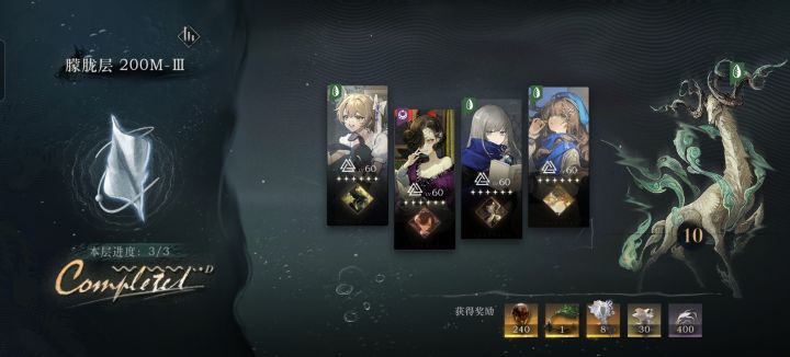最后是200m-3,这个boss无法免疫封印和沉睡,针对一下就好了,也很好打。首选柏林以东,或者能打沉睡的,但是沉睡好像只有一个五星角色能打,我没练不清楚控制效果有没有柏林好。这里卡boss开大的轴,开柏林的大,注意出牌要给柏林大招循环。boss在这期间也会产生封印抗性,注意下就好了。剩下的输出慢慢刮就好了,拿捏。