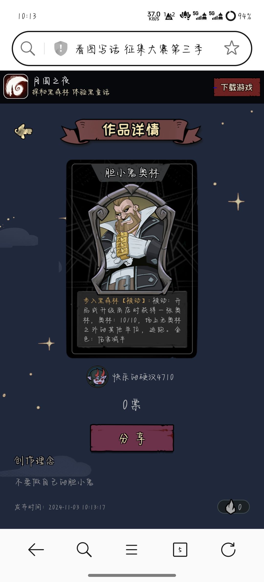 胆小鬼奥林的背景故事:奥林明明是个大块头,但胆子却异常的胆小,好在往那一站足够吓跑很多敌人了。“我要变得勇敢,要更好的保护朋友。”奥林这样想,好像小红帽一直想进黑森林寻找他的外婆,我可以陪她找到外婆,还可以在黑森林里锻炼胆量。对着镜子给自己鼓了鼓气,随后便推开门向着小红帽家的方向走去。