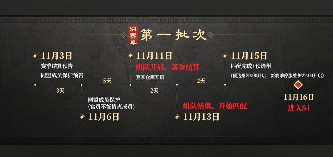 11月3日0点S4问鼎赛季(九州鼎沸)第一批次服务器开启赛季结算和同盟成员保护预告;