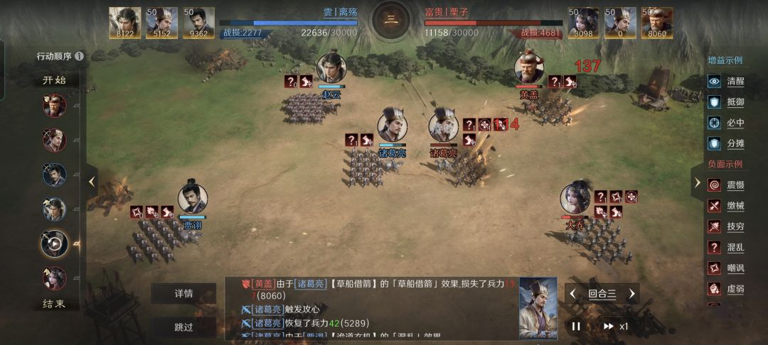 具体到这场战斗,诸葛亮和贾诩在鱼鳞阵的后排都是吃奇谋增益的。他们还能借助风暴,在群体混乱对手的基础上再添一味技穷,强有力的压制了对面黄盖的输出。大黄猪的输出大头主要是黄盖,或者诸葛亮、黄盖各自承担一半。把他们都搞乱,或者压制黄盖的主动战法苦肉计,就等于是给老虎拔掉了牙,让克敌制胜变得很容易。