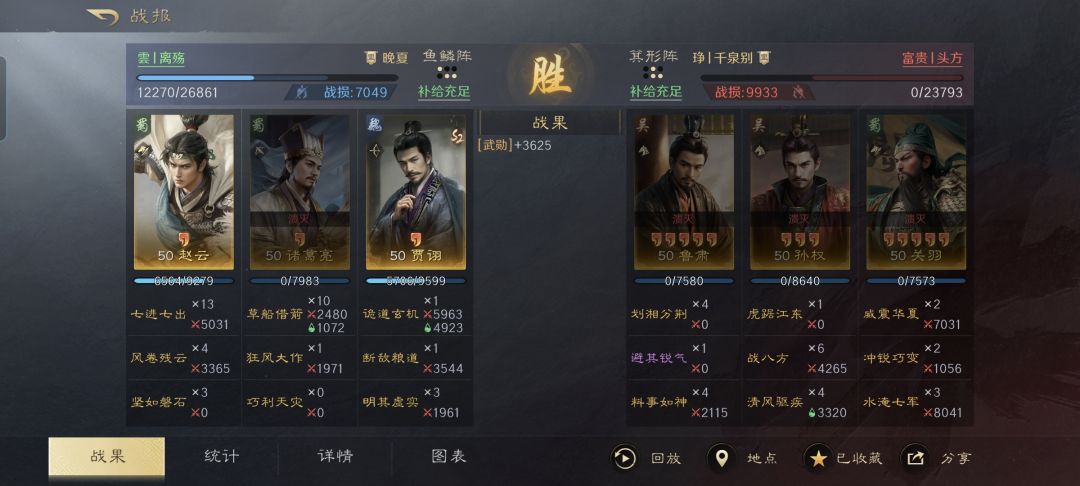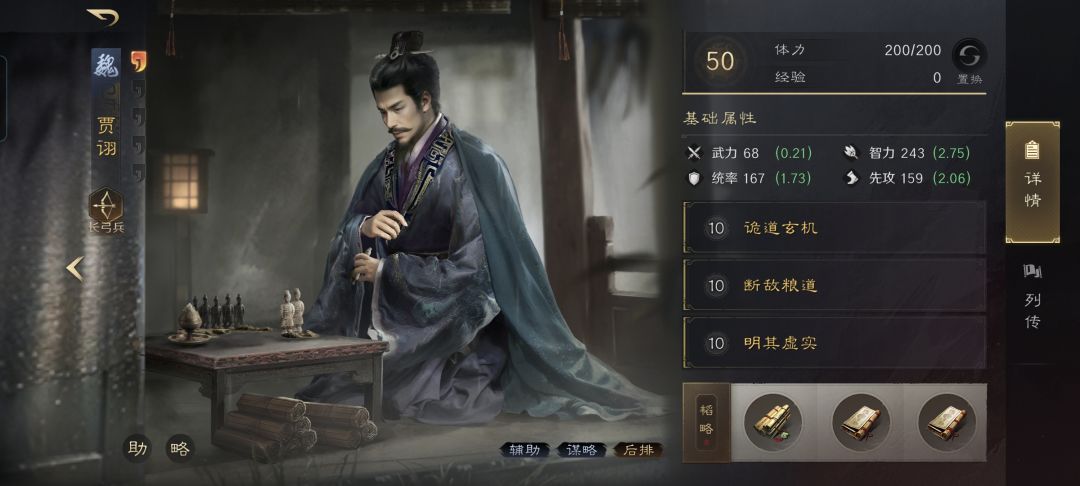 贾诩战法:诡道玄机+断敌粮道+明其虚实。韬略库:诡道(专属)+谋令善本+料敌善本。长弓兵特性洞悉,专精点亮谋定后动。毫无疑问,赵云在前排的话,基本就是鱼鳞阵没跑了。通过风卷残云,赵云进一步提升了自己的规避率,借助鱼鳞阵前排的站位加持,他自然也能更好的利用嘲讽来牵制对手。