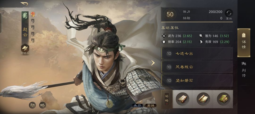 赵云战法:七进七出+风卷残云+坚如磐石。韬略库:技艺善本+胜敏善本+神勇(专属)。轻骑兵特性疾驰,专精点亮游刃有余。