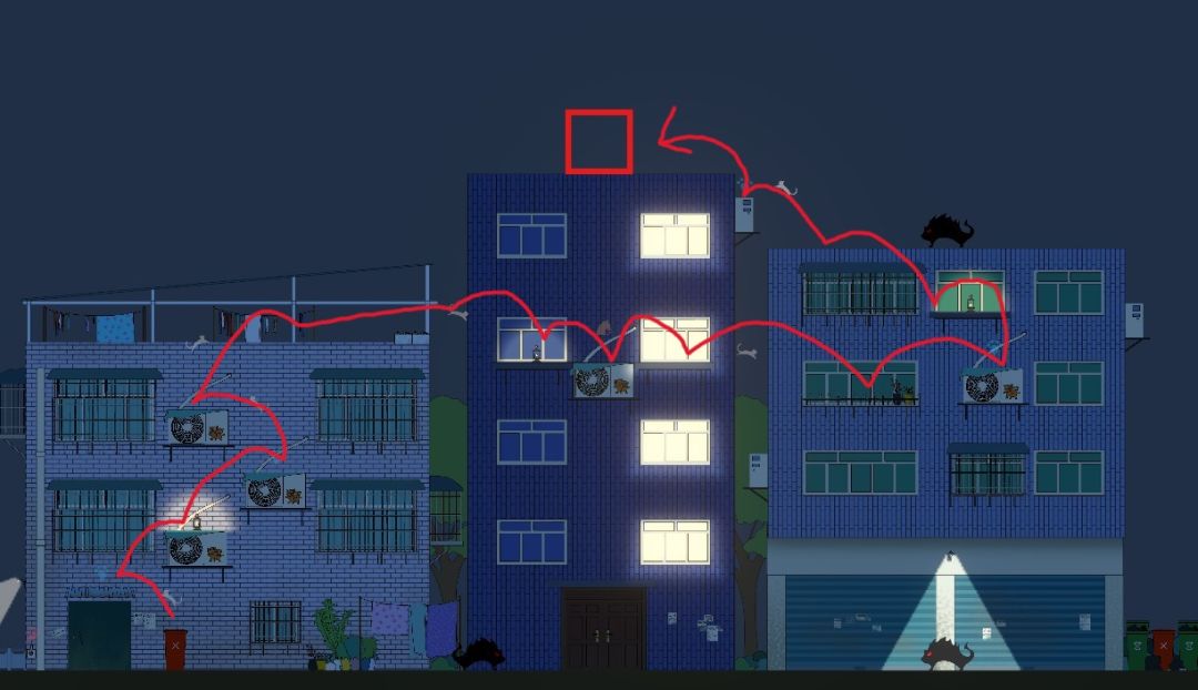 这个区域的玩法主题是清理和释怀,体现在把东西打到地上,去往楼顶看星星,楼群上的花盆都可以打落等设计上,预示着主角需要从悲伤中走出来,游戏中的每一个室内场景其实都代表主角的内心世界,而这个区域在进入室内之前,需要摇动铃铛3下,表示着打开主角的内心世界大门。