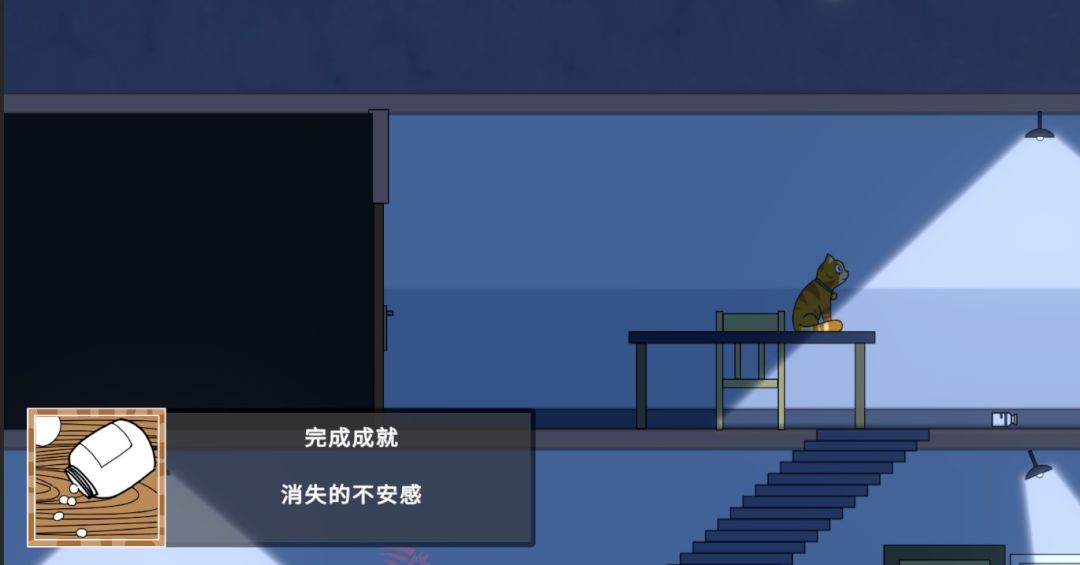 第一个区域的场景(图2)设计采用的是偏抑郁伤感的蓝色色调,其中在喵干净所在的屋子是一个对主角当前生活的隐示,喵干净给玩家的任务是把桌面上的杂乱的东西都清理到地上,玩家游玩中会发现桌面上其实都是杂乱酒瓶(图3),这表达着男主因遭受妻子离世的打击而酗酒度日,而厨房的台面上却是整洁的没有什么使用痕迹,这里对照结局剧情中,主角会经常为妻子下厨的设定,因为此时妻子已离世,主角就几乎不使用厨房。在三楼的桌子上,摆放着一个药罐(图4),它是隐示着真实世界中主角用来轻生的药,这里如果玩家把药打翻在了地上,剧情上就会出现【果】影响【因】的反向变化,玩家就可以看到主角因为喵力打翻了药罐,吃下的其实是普通维生素从而没有轻生离世的好结局。这里三楼有黑色遮挡的房间是一个彩蛋房间,可以从出口窗户跳上屋顶,到达其窗台然后进入房间,这里的设计和主剧情没有直接关系,是个轻松的彩蛋。