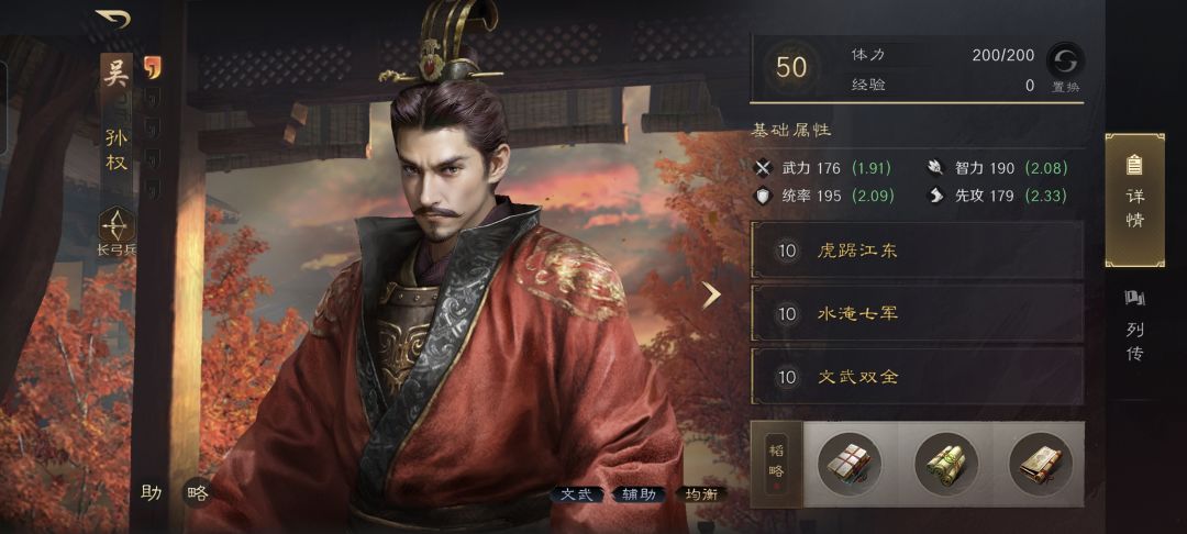 孙权战法:虎踞江东+水淹七军+文武双全。