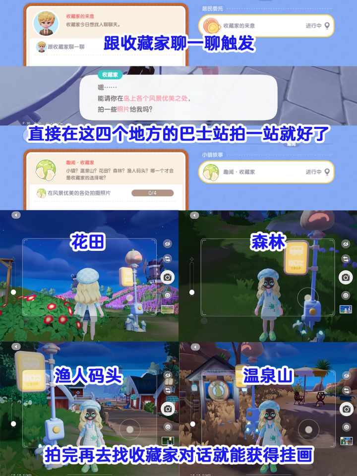 2️⃣触发后先聊,聊完去四个地方拍照(花田、森林、渔人码头、温泉山),直接每个地方的巴士站那拍就好,拍完直接巴士跳到下一个地方