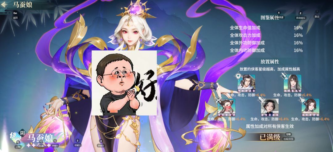 攻击窃取(初始):【星落】或【星陨】命中敌方侠客后,马蚕娘窃取该侠客5%的攻击力,最多不超过马蚕娘自身攻击力的5%,最多对同一目标窃取2次,该效果持续整场战斗,不可驱散