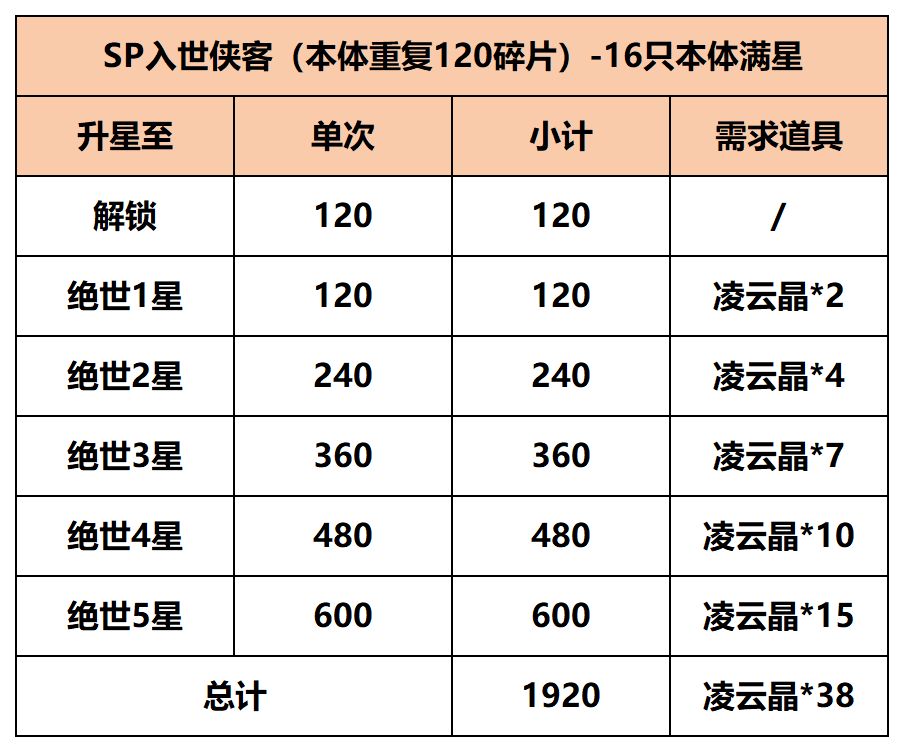 入圣侠客从解锁到绝5,一共需要1920枚碎片+38枚凌云晶。