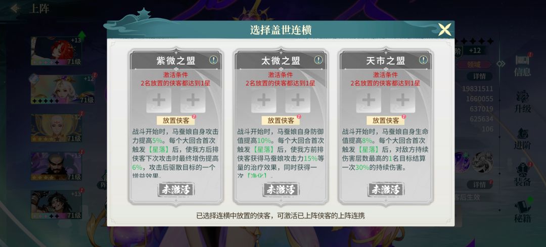比如:我们选择了【太微之盟】,上阵了鬼王和老马,也在【紫薇之盟】中放置了狼王,但是这样无法激活鬼王的上阵连携。