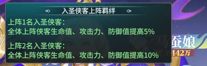 全队属性提升:如下图示,每上阵1/2名入圣侠客,可使我方全体上阵侠客提升5%/10%的攻击,双防,生命值——因此,每一名入圣侠客,都值得入手