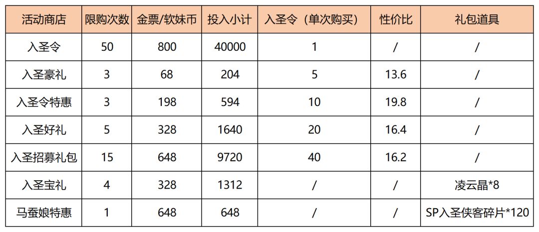 氪金礼包中,性价比=软妹币/入圣令数量,各位大侠按需氪金,丰俭由人。