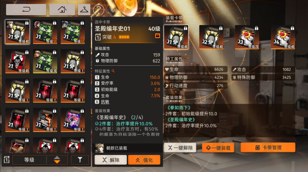 关于词条选择,每张卡带1-3号位都有2个攻击选项,推荐7.5%的攻击力(比暴击爆伤提升高),4号位主c推荐爆伤,副c推荐爆率。5号位克敌(克制10%爆率)、斜击(1、4号位加攻击)等满足条件都是不错的选择。暴击率更泛用。